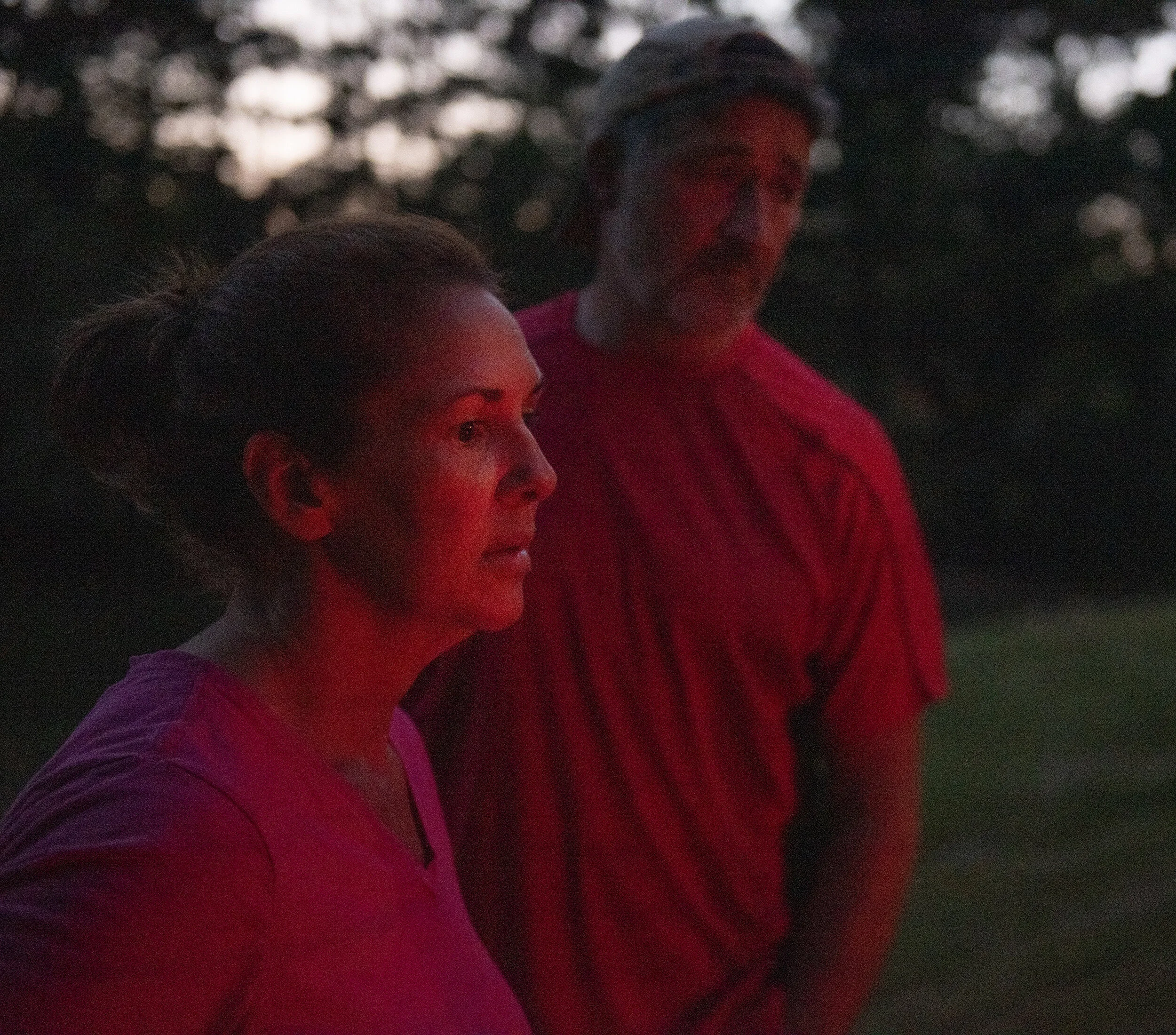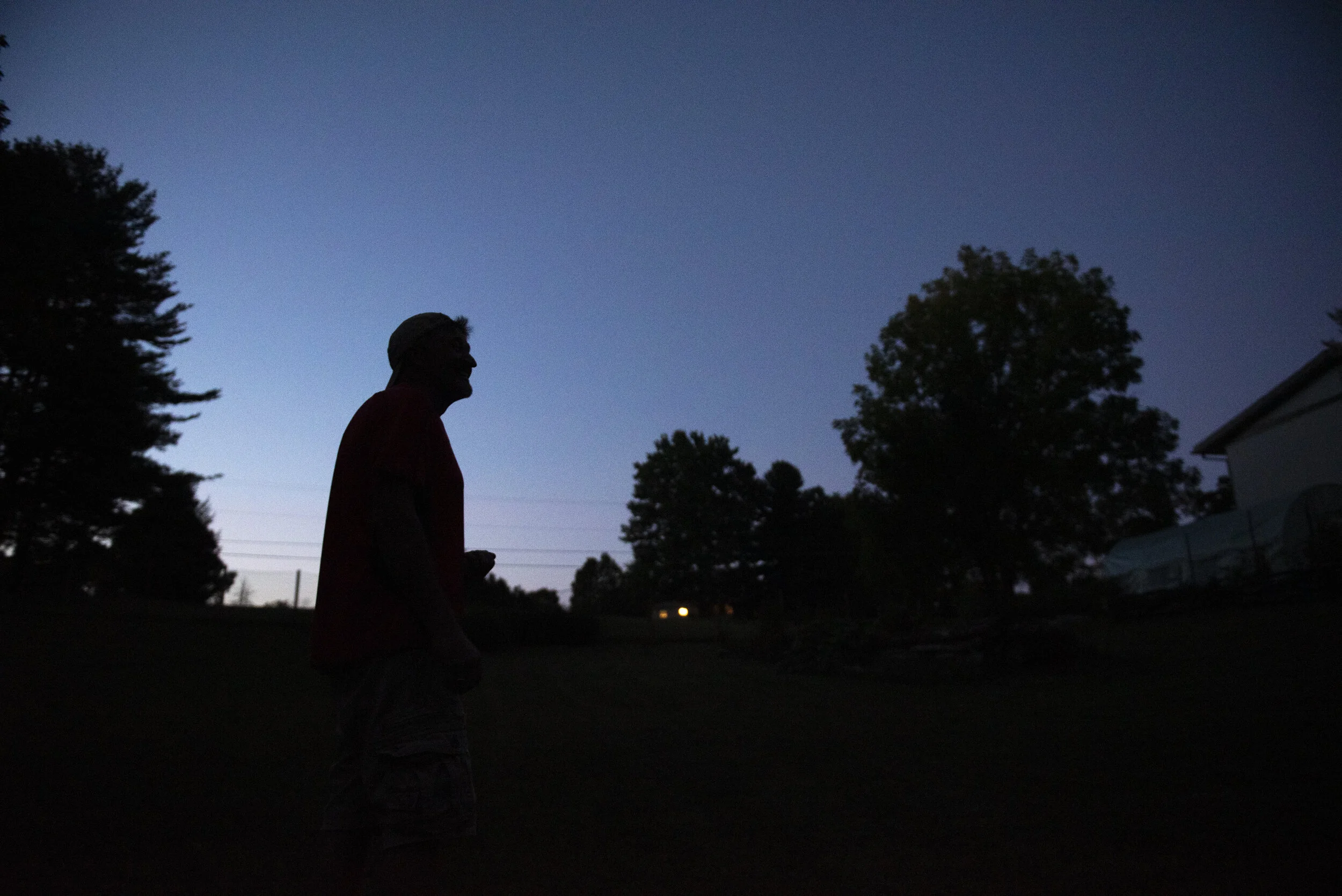 Marlene and Greg look watch their chickens settling in for the night in their chicken coop Greg build for them. Marlene calls the chickens her "prostitutes in the red light district” because of the red light the coop emits.