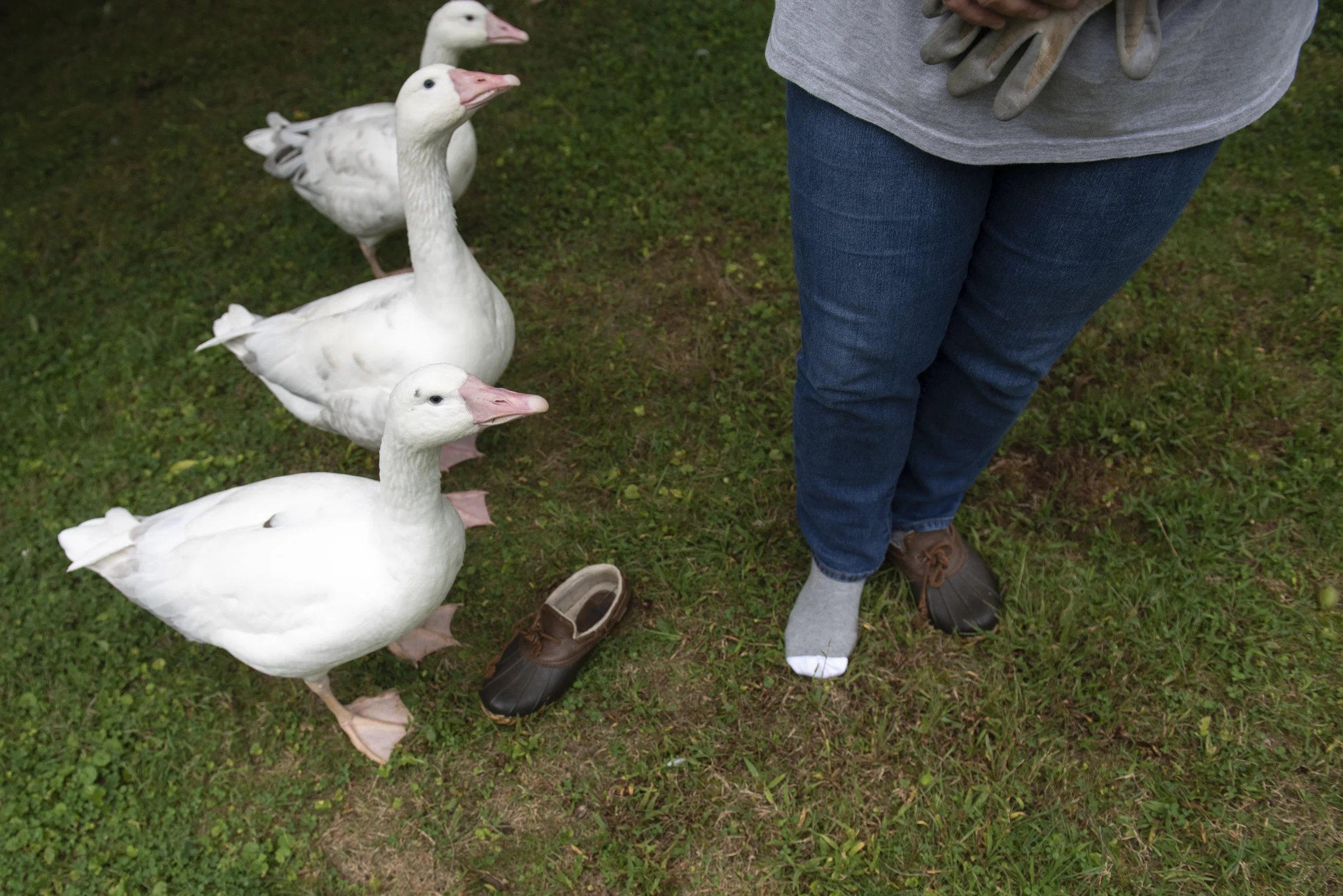 Three of the Poches’ geese nibble on Marlene’s shoes as she leads them around the yard. The geese listen to and follow both Marlene and Greg.